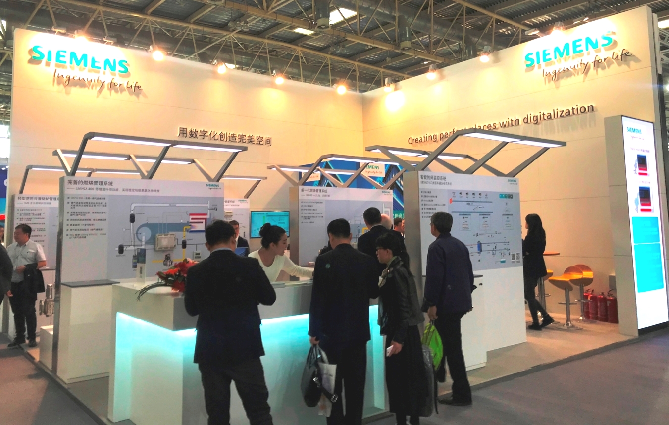 2019年5月6日至5月8日,西門子以“用數字化創造完美空間”為主題,攜冷凝鍋爐解決方案參展中國國際供熱通風空調、衛浴及舒適家居系統展覽會(中國供熱展)。在展會上,西門子首次展示了3MW零壓閥組并在中國全新發布了AVS74中文圖文操作界面。此外,還展示了輕型商用冷凝鍋爐管理系統、中大型冷凝鍋爐管理系統、前混型燃氣閥組、后混型燃氣閥組、完善的燃燒管理系統、新一代燃燒管理系統、智能熱網監控系統和西門子家庭采暖控制產品。